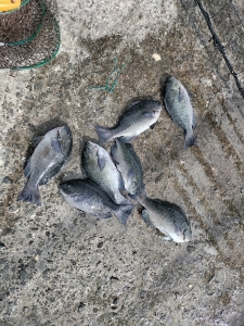 早朝、アオリイカ狙いでしたがお昼前に1匹釣れました。その後、5番に移動してグレ釣りと1日中釣りを楽しみました。アオリイカは1匹で残念でしたが グレは30センチUPが2匹釣れたので良かったです。