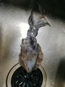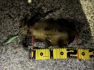 アオリイカのアタリは3回ありましたが、掛けれたのは1匹でした。足元近くで流していると スズキの群れが見えた時に掛かりました。