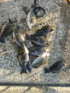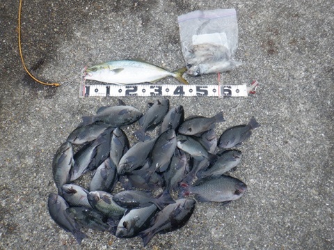 サビキ、泳がせ、フカセと忙しい1日でした。小アジはまだ終日釣れています。アオリは早朝のまだ薄暗い時間帯のみヒット。ハマチは午前9時半頃、グレは10時より深ダナで釣れました。午後から鉛筆サヨリが湧いて、釣り難かったです。