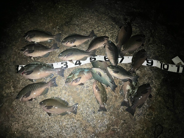 朝一でアオリイカを狙い。 その後、フカセ釣りをしました。スズメダイがあまり出てこなく 釣りやすかったです。グレはほとんど見えなかったですが、手前は小型多く20〜30メートル沖2〜3ヒロくらいで釣れました。