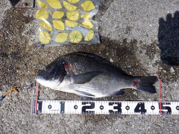 最初のマキエに大量のボラ、その中を水面までやる気の良型グレを3枚かけたのですが、一枚は足元手前で針外れ、一枚はチヌ竿では止めきれず足元ケーソンで切れて、1枚しか取れませんでした。