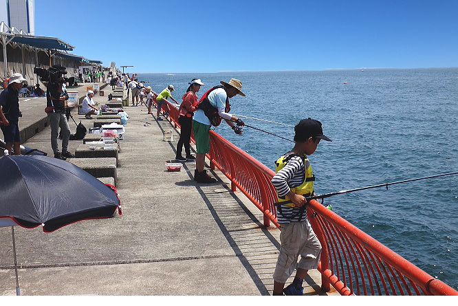 東エリア、福田川の東部埋立地に位置する広大な海釣り公園です。園内ではエサ、道具の購入、レンタルが出来、トイレ、レストランも完備され、ファミリー向けの釣り場です。至る所に魚礁が設置されているために、魚種も豊富で1年を通して色んな魚が狙えます。特に初夏〜秋にかけてはサビキ釣りで小アジやイワシが釣れ、それを追って青物やアオリイカが寄って来ます。魚礁やテトラには根魚も多く住み付き、専門に狙う釣り人も多く見受けられます。その他、チヌ、コブダイ、カレイ、アイナメ、スズキが人気のターゲットです。