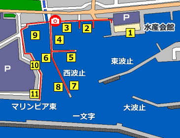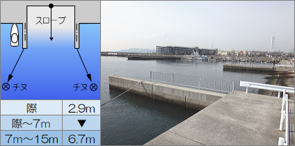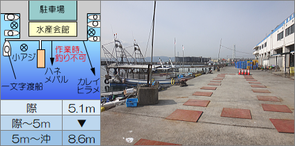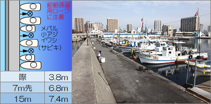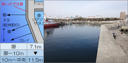 潮通しも悪く、港の一番奥にあたるため普段はあまり釣れない。しかし、3月末から4月初旬に大型チヌがフカセで釣れる。ポイントは5〜10m先。