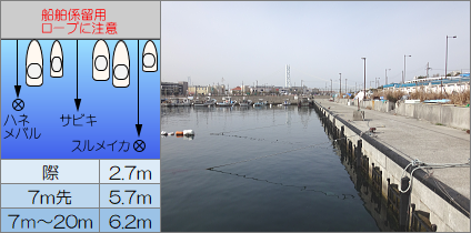 船と船の間を狙う。際は浅いためあまり釣れない。飛ばしサビキで小アジ、イワシ、メバルが釣れる。夏から秋にかけてエビ撒きでハネ、アコウも釣れる。