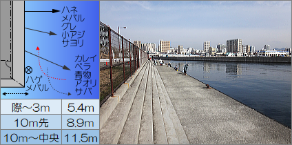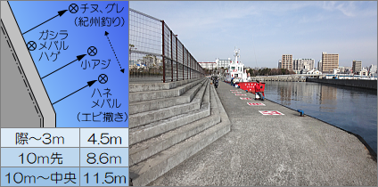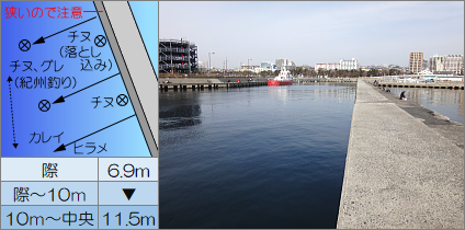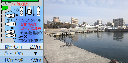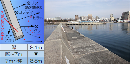 紀州釣りでチヌやグレが釣れるがボラも多い。夏場のエサはフナムシが有効。ポイントは20m先。水深が深いためフカセ釣りは適さない。カレイやハゲも良く釣れる。